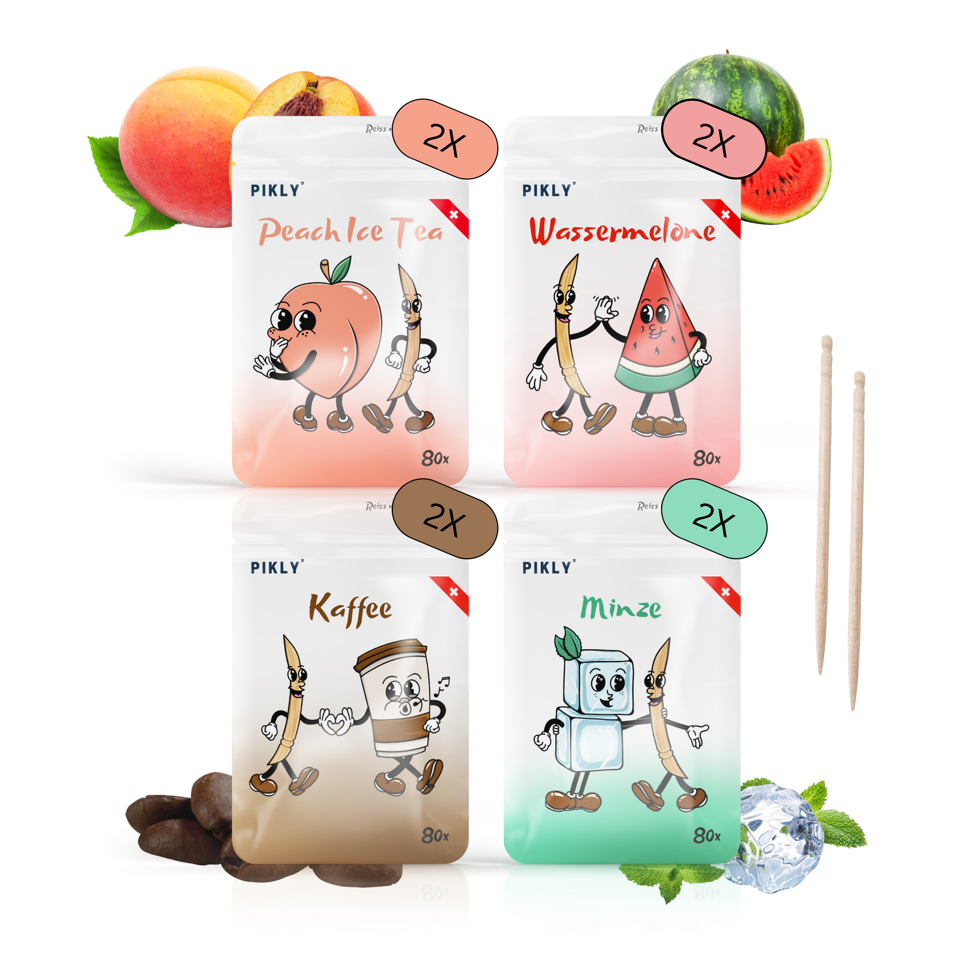 Das Pikly Medium Bundle bringt dir alle vier Signature-Flavors 2x in einem Set – Wassermelone, Kaffee, Minze und Pfirsich.